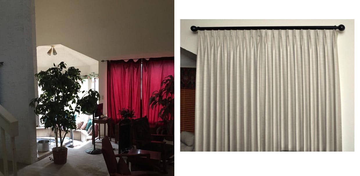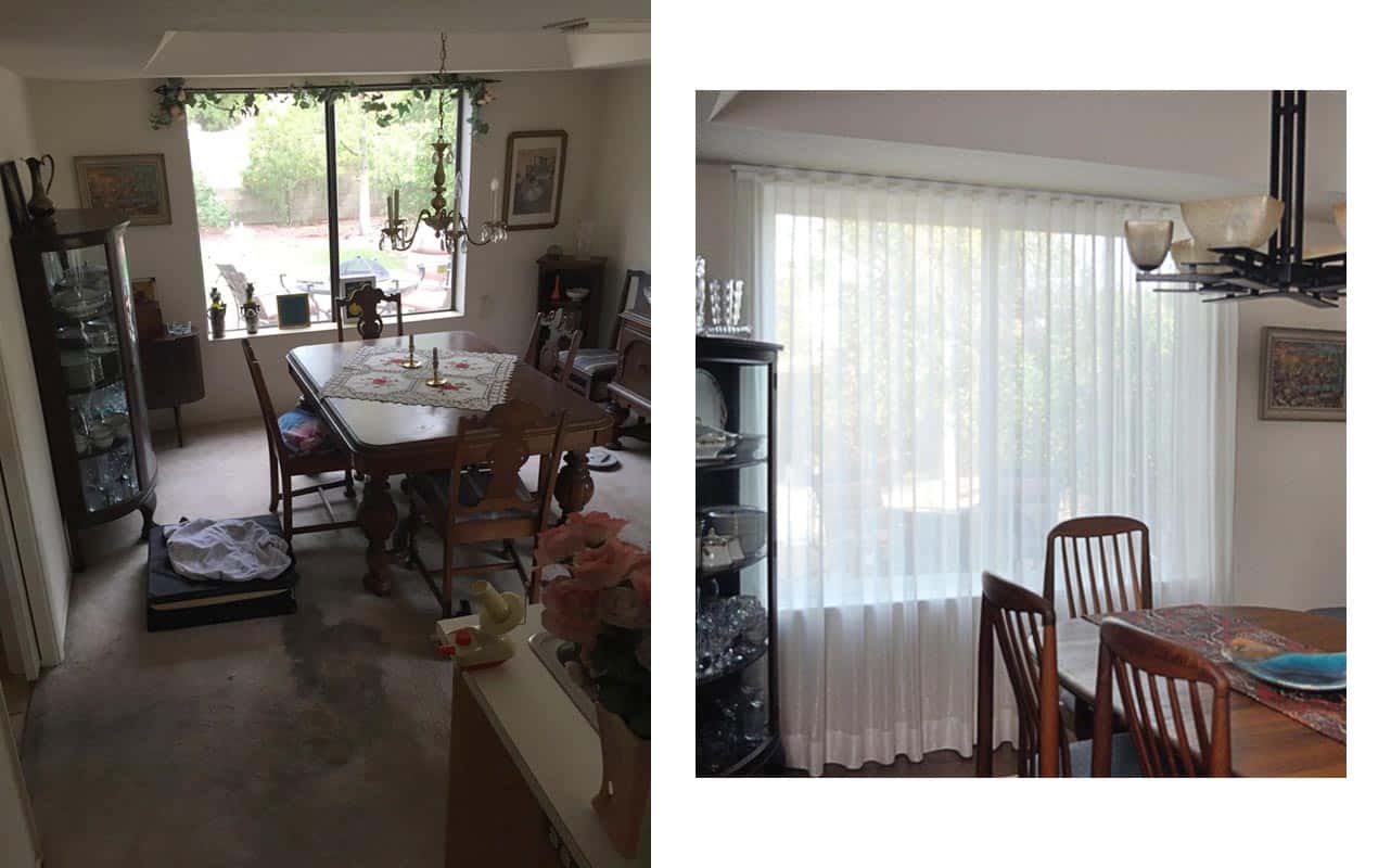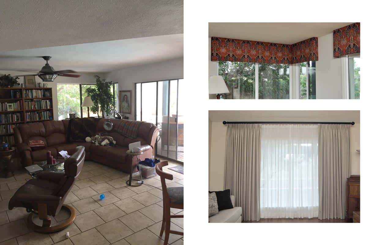 After doing a complete re-model throughout. We helped client with fabric selections and designed custom window treatments with cornice boxes, ripple fold sheers, and functional sheers and drapes in the Family Room, Fireplace Conversation Area, Dining and Living Room.