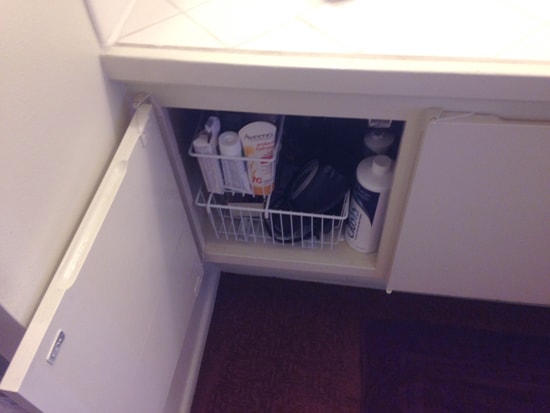 The top tile is the floor and shower surround. The striated beige, blue and brown pattern visually lift up the space, making a somewhat low ceiling seem taller. 12 X24’s are laid in a brick pattern across the floor to make the room seem wider.