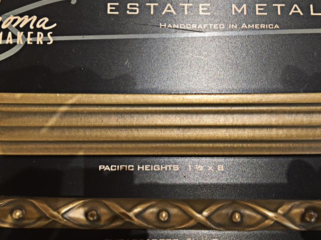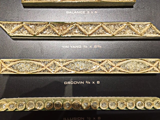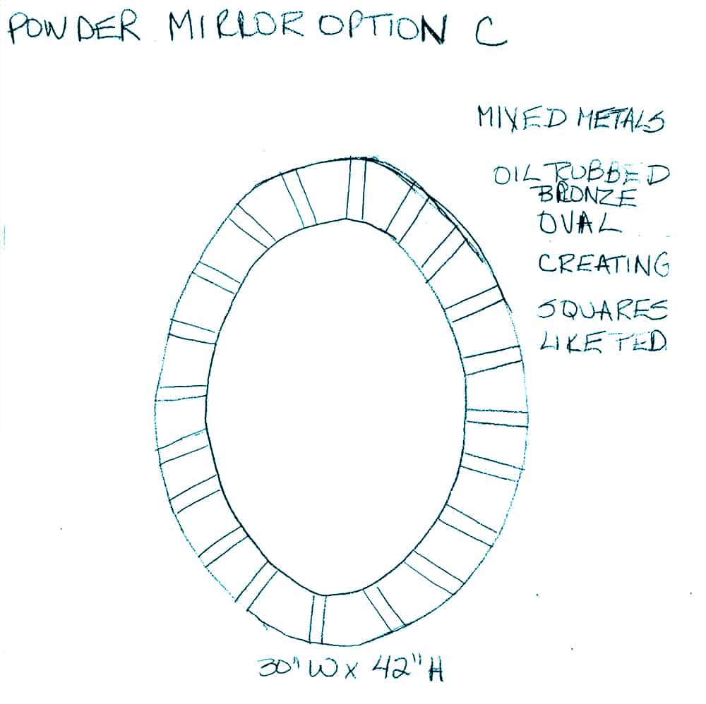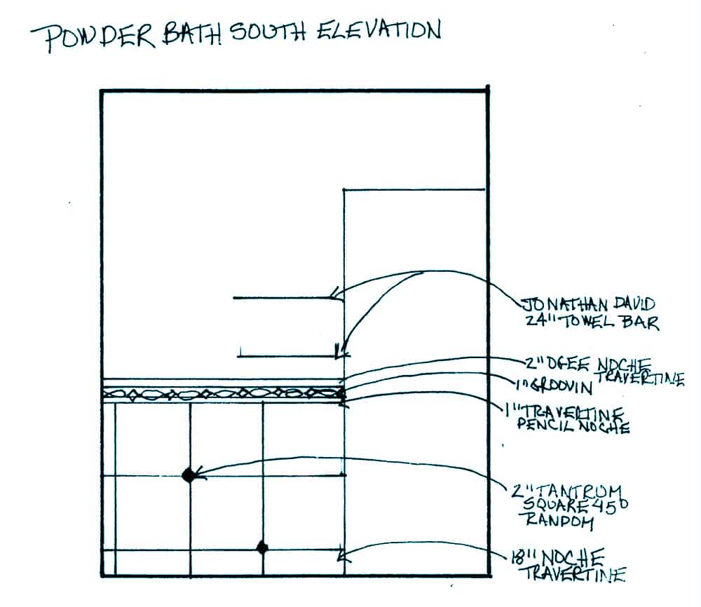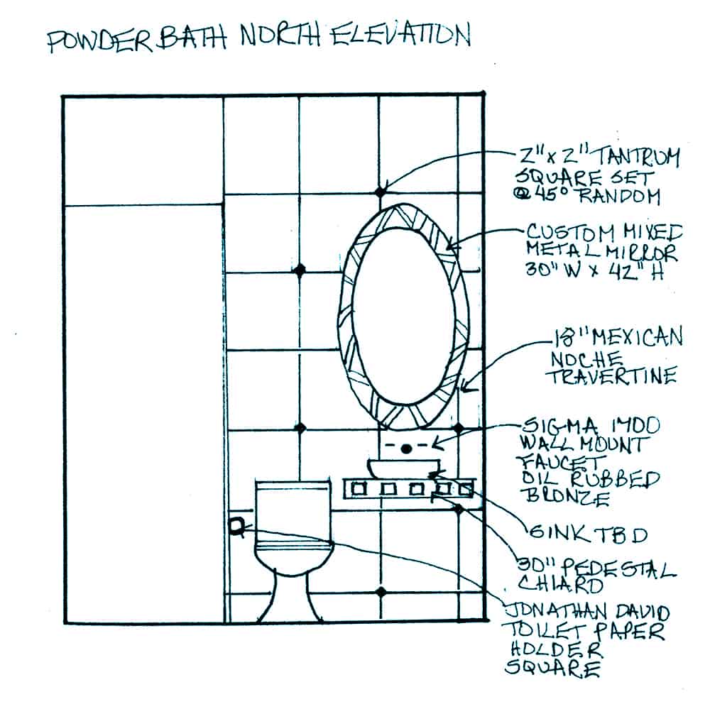 In the Powder Room we wanted to keep the flow going throughout the space so we custom designed an oval mirror in the same mixed metal combination as the kitchen band. Since the existing floor was in a Versaille pattern travertine, we decided to keep it simple by adding straight pattern travertine tile partially up the walls with random square tantrum medallions set at a 45-degree angle to create a diamond with 1” travertine pencil band, 1” Groovin tantrum band topped with Ogee travertine. Big Bang for a small space!