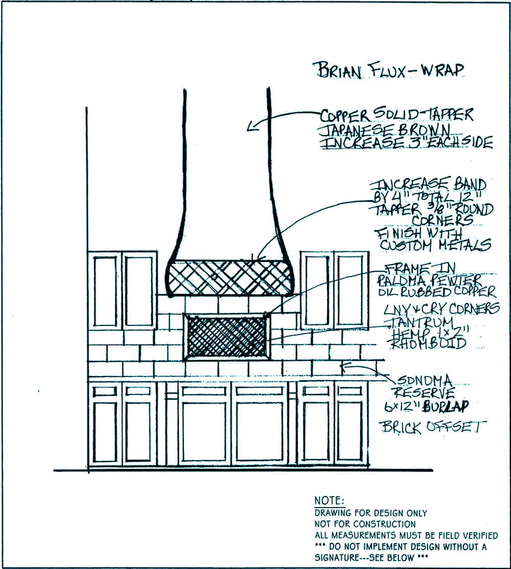 Client wanted a rustic contemporary update of her recently purchased home. In the Kitchen she wanted rounded corners for safety and a more tapered look for the hood. After reviewing some pictures that she liked, we suggested increasing the band to twelve inches making it one of the main focal points. With the help of an artistic metal sculptor, a mixed metal combination was created for the band and a copper foil for the remainder of the hood. We designed around the existing cabinets and granite countertops including the Noche travertine flooring. We choose Sonoma Tile in the color Burlap in 4” x 8” offset brick pattern for the backsplash. Behind the range, a center piece of Burlap Sonoma Tile and Hemp Tantrum using a rhomboid pattern with a copper frame. This part of the Kitchen became the focal point!